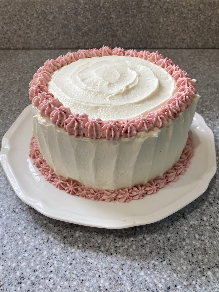 Turn out the first layer of your cooled cake, flat side down. Pro tip: don’t forget to take the parchment paper off of the bottom of the cake. Spread about 1/4 of the frosting on top of the layer before stacking on the second cooled layer. Use remaining frosting to cover the sides and top. I saved a little bit of frosting back to mix with the freeze-dried strawberries for some color. You could use food coloring if you’d prefer…or another ground-up freeze-dried fruit. I used a star tip and a piping bag to make a border around the cake. It definitely looks homemade, but fancy homemade.