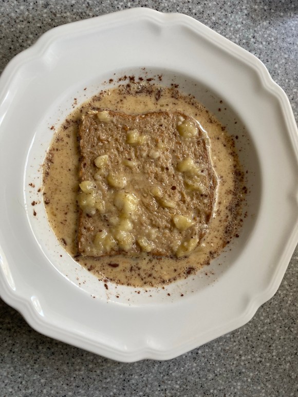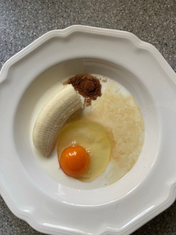 The easiest way to make this would be to put the banana, egg, cinnamon, milk, and vanilla in a food processor until smooth. But I hate cleaning the food processor, so I just mashed the banana to death with a fork and whisked in everything else.