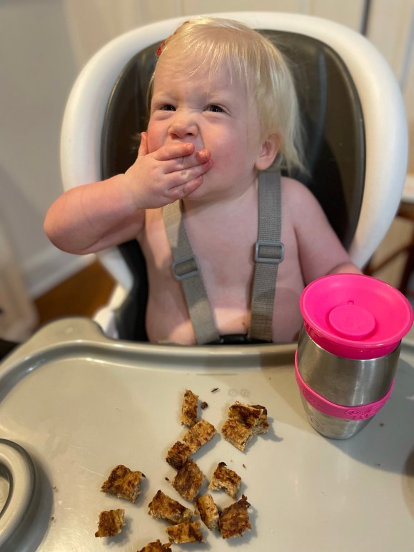 Hattie is a banana junkie, so much so that we have to call it “something yellow” around her so that she doesn’t lose her mind in anticipation of the “nana”. She can eat a large banana in four bites. It’s a pretty amazing party trick/choking hazard. Needless to say, this banana-sweetened french toast was a huge hit.
